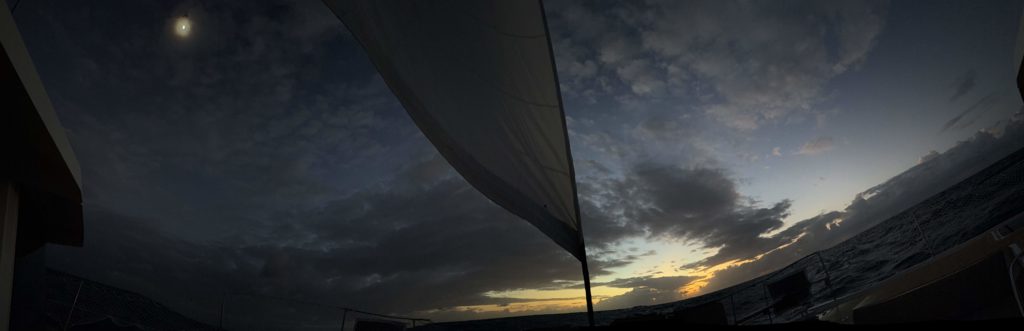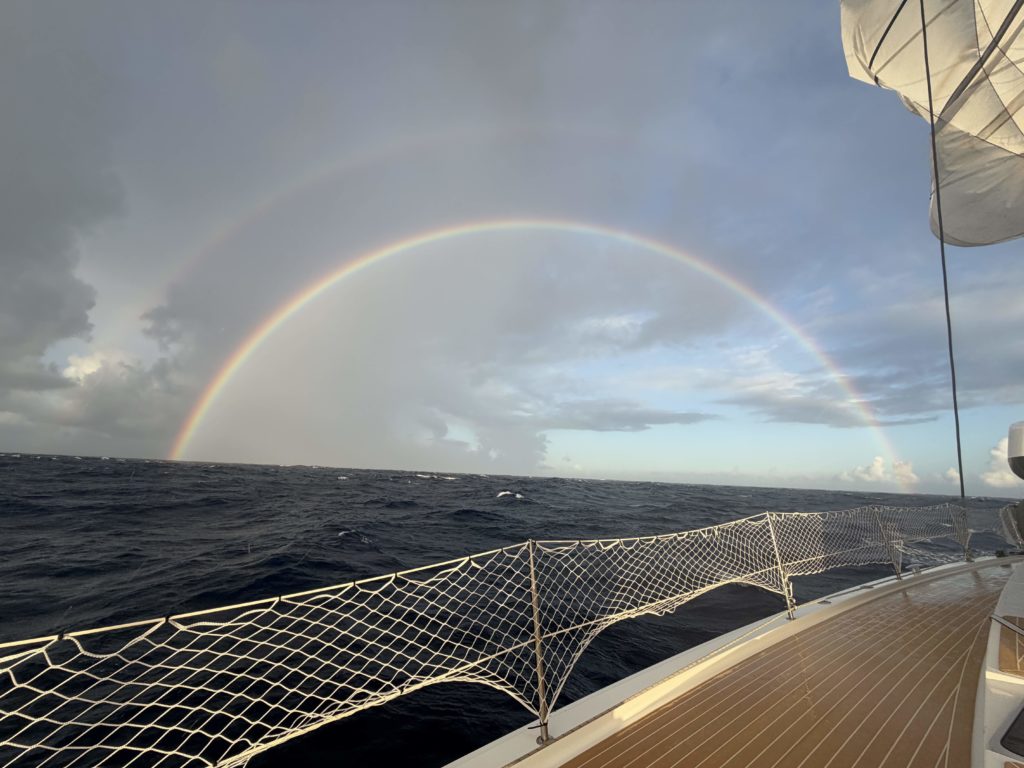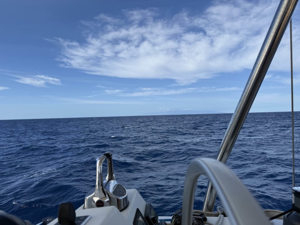 Alors si vous scrutez bien l’horizon, vous pouvez parfois apercevoir les nuages noirs avec la pluie dessous qui approchent. Mais vu le temps nécessaire pour réduire les voiles sur ce bateau, l’anticipation est cruciale. Tout se passe bien, un peu de bricolage nécessaire à bord, mais nous vous expliquerons cela un autre jour.