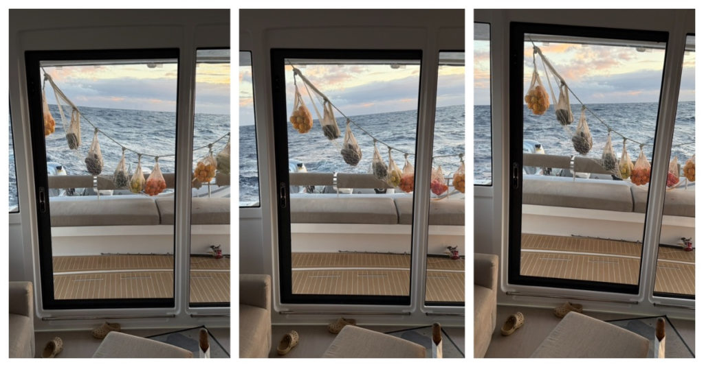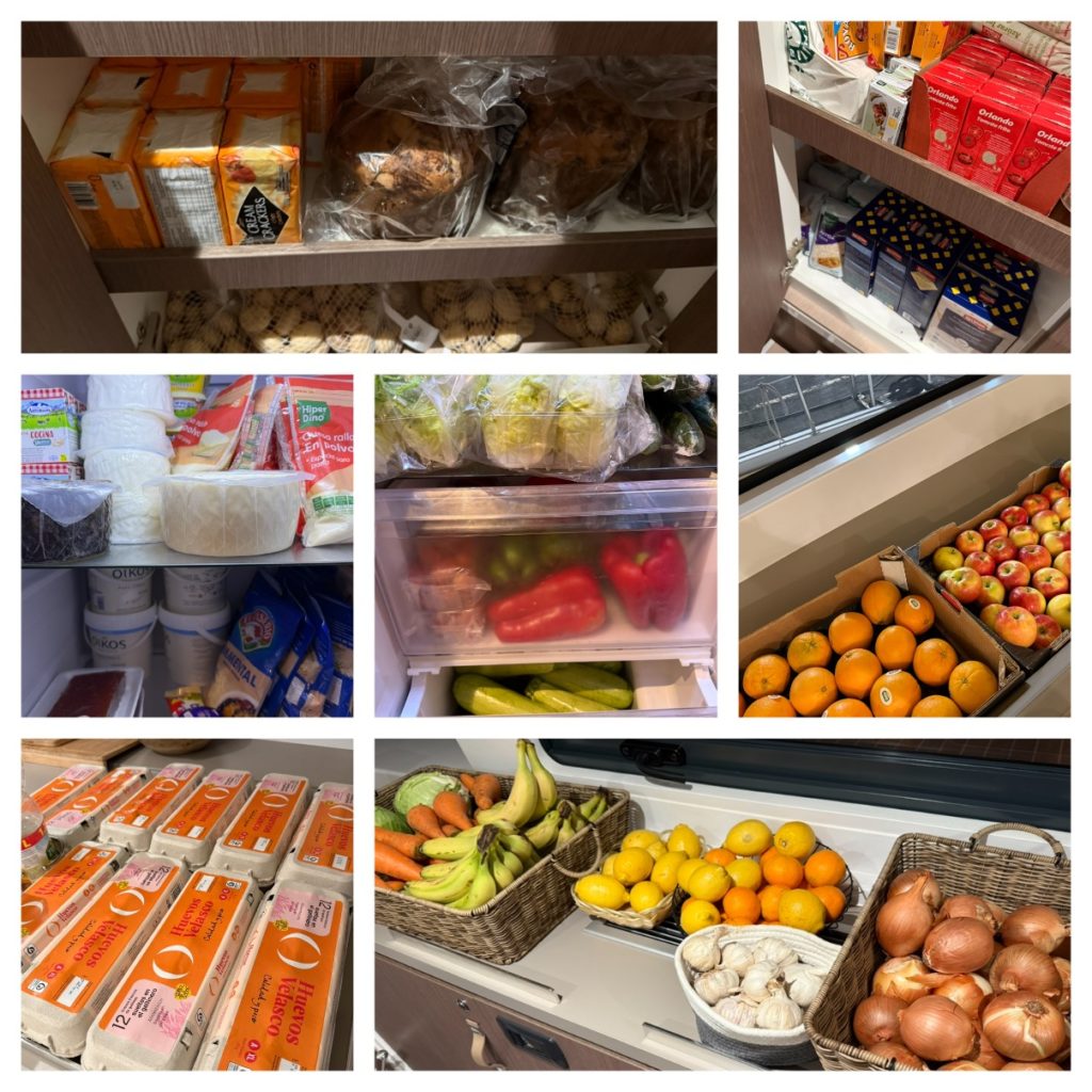 Certain d’entre vous se demandent ce qu’on mange à bord… et non pas de lyophilisé, que du frais! On n’a pas embarqué autant de fruits et légumes que pour les photos à l’arrière du bateau!