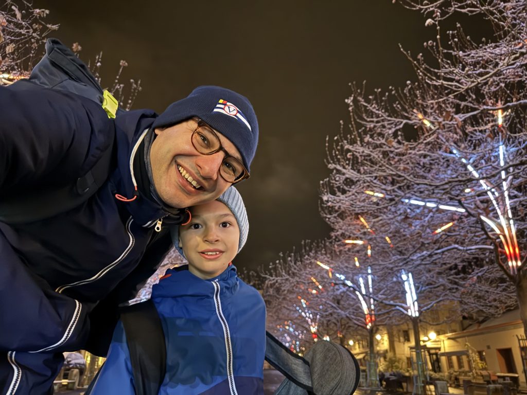 A quatre heures du matin, il neigeait sur la place du marché de Carouge lorsque nous sommes allés prendre le bus pour l’aéroport avec Albert, emmitouflés dans nos couches d’habits.