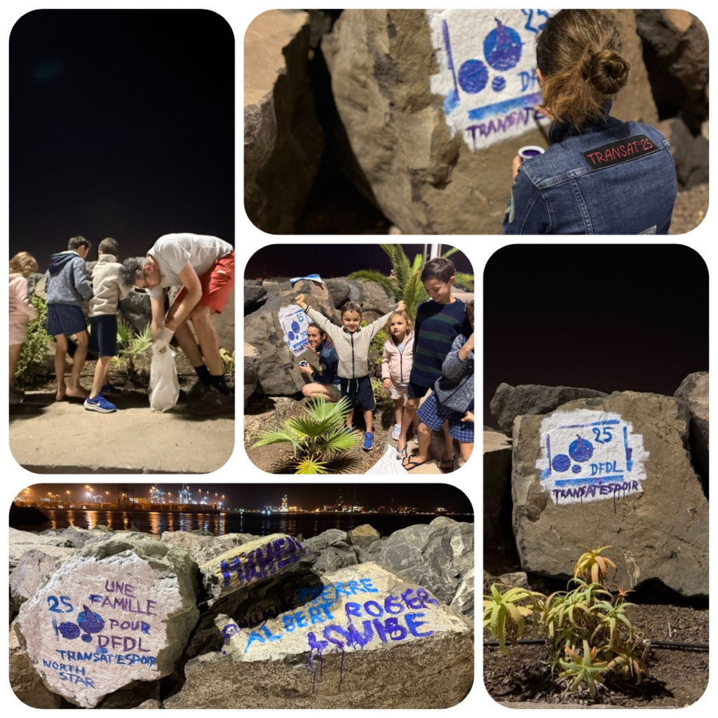 En nous baladant l’autre jour sur la jetée du port de Las Palmas, nous avions vu toutes les oeuvres peintes sur les rochers de la digue face au port. Une tradition est née de laisser une empreinte avant de partir traverser l’océan. Cela a l’air facile, mais pas tant que ça en fait… et en plus une fois que nous étions lancés, nous en avons aussi fait une dans le petit port voisin où se trouve « NORTH STAR »…