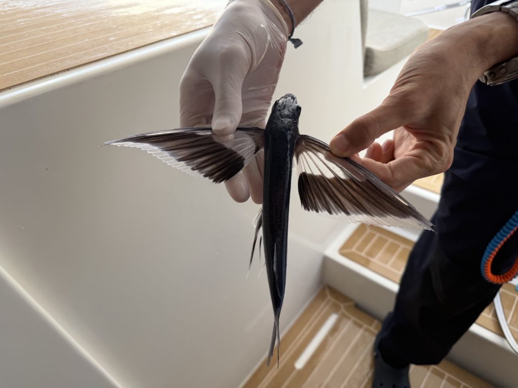 Pour l’heure, nous voulons aussi partager avec vous la petite surprise de ce matin sur le pont… un poisson volant. Le passager clandestin qui sentait déjà la marée a été prié de débarquer.