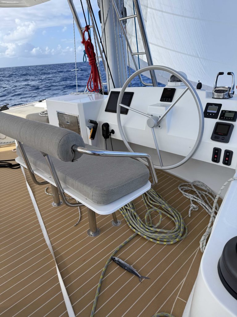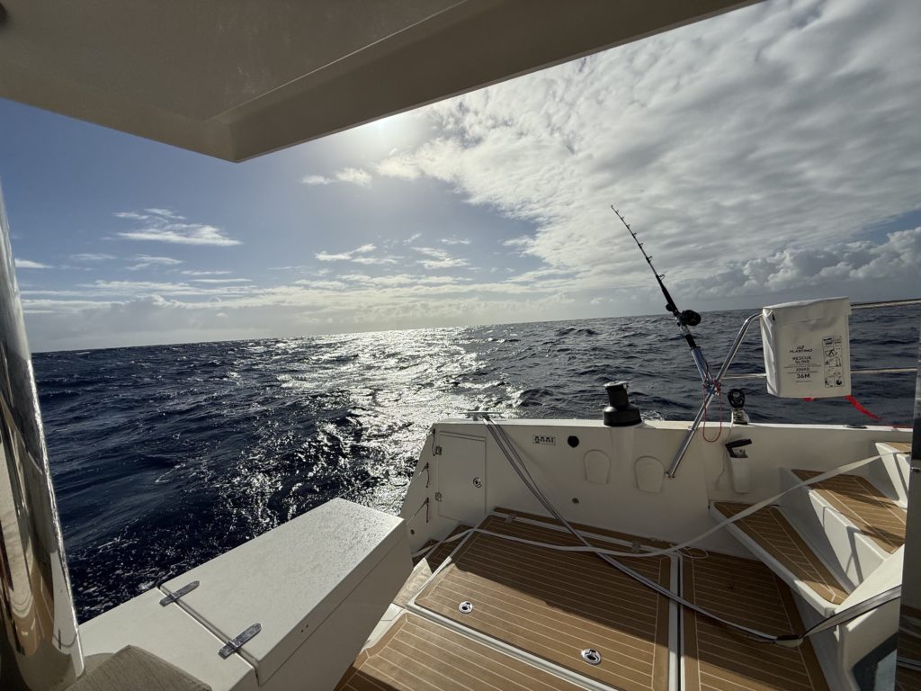 La pêche avec notre canne de traine n’a pour l’instant pas été très fructueuse, mais notre vitesse élevée avec les accélérations dans les vagues ne sont pas idéales pour pêcher efficacement. Si nous remettons la ligne à l’eau avec succès, nous ne manquerons pas de vous le faire savoir!